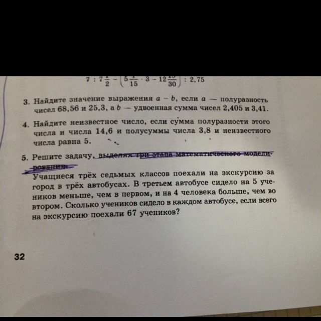 Учащиеся трёх седьмых классов поехали на экскурсию за город в трёх автобусах. В третьем автобусе сделано пять учеников меньше, Чем в первом, И на четыре человека больше чем во втором сколько учеников сидел в каждом автобусе если всего на экскурсии поехала 67 учеников