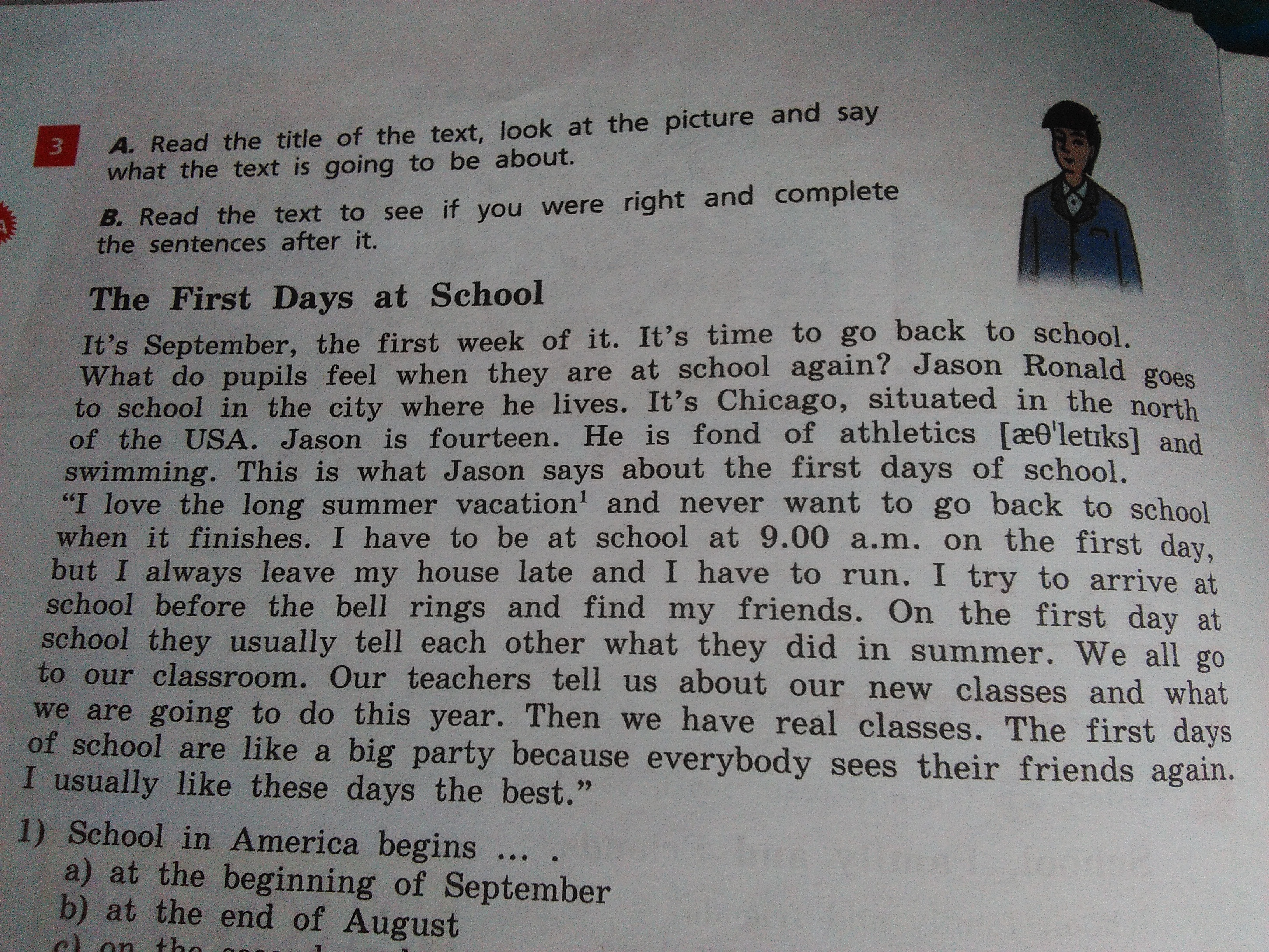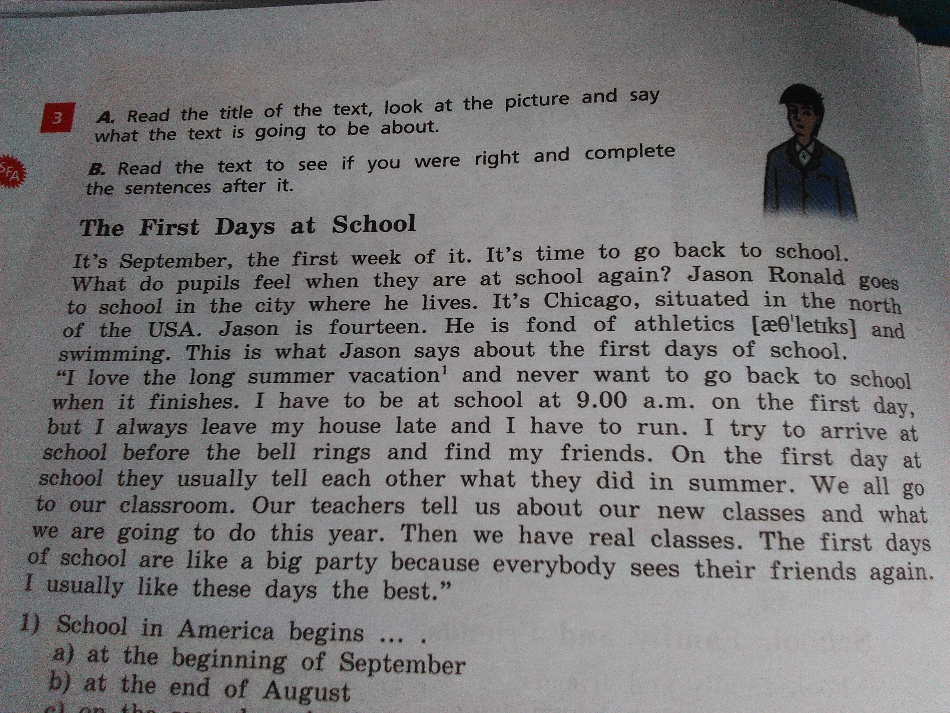 Сентябрь, первая неделя учебы. Время вернуться в школу. Что чувствуют ученики, когда они снова приходят в школу? Джейсон Рональд ходит в школу в городе, где он живет. Это Чикаго, которое находится на севере США. Джейсону 14 лет. Ему нравится атлетика и плавание. Вот что Джейсон говорит о своих первых днях в школе.«Я люблю длинные, школьные каникулы и никогда не хочу возвращаться в школу, когда они заканчиваются. Я должен быть в школе в 9 утра в первый день, но я всегда поздно выхожу из дома и вынужден бежать. Я стараюсь прибыть в школу до звонка и найти своих друзей. В первый школьный день они обычно рассказывают друг другу, что они делали летом. Мы все идем в наш класс. Наши учителя рассказывают нам о наших новых предметах, и что мы будем делать в этом году. Затем у нас проходят реальные уроки. Первые дни в школе как большая вечеринка, потому что каждый видится со своими друзьями вновь. Обычно такие дни мне нравятся больше всего».