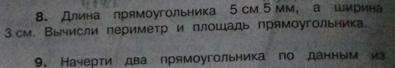длина прямоугольника 5 см 5 мм а ширина 3 см Вычисли периметр и площадь прямоугольника
