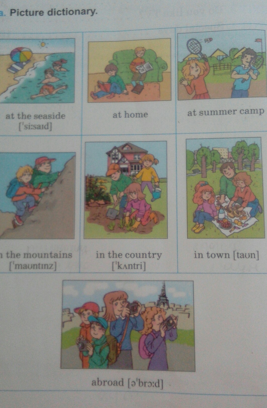 эт зе сисайд , эт хоум, эт саммеr кэмп, он зе маунтинс, ин зе кантри, ин таун, эброад (как же это офигенно)