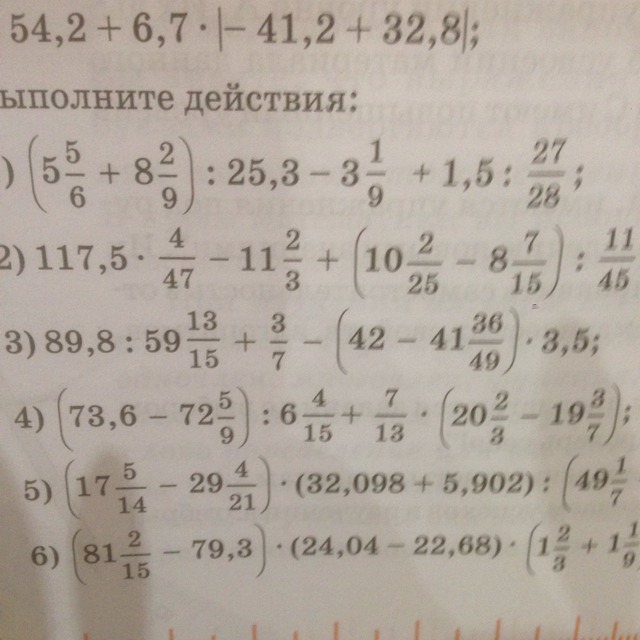(73,6-72целых5/9):6целых4/15•(20целых2/3-19 целых3/7)=(368/5-653/9):94/15+7/13•(62/3-136/7)=47/45•15/94+7/13•26/21=1/3•1/2+2/3=1/6+2/3=5/6