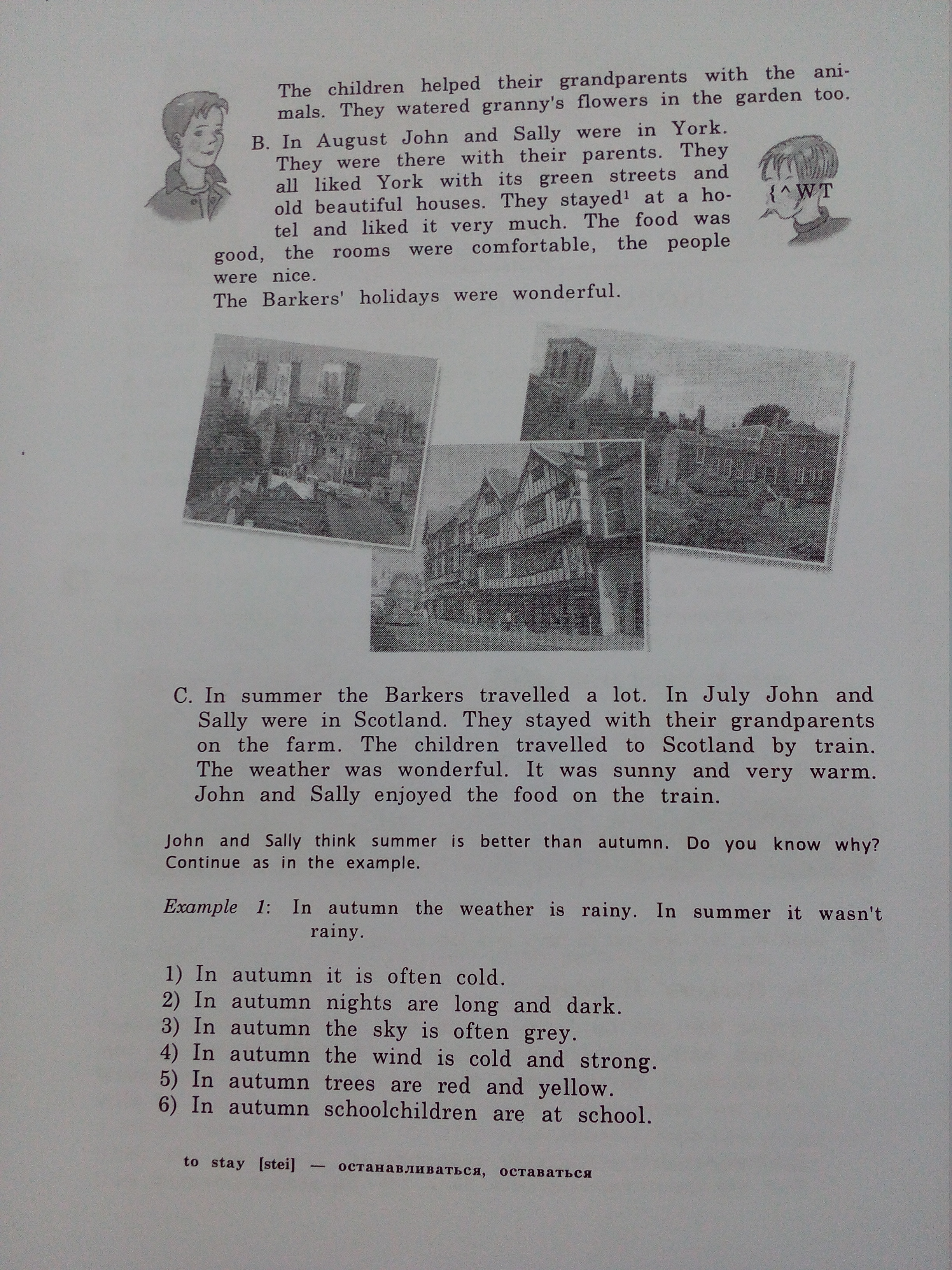 Б. В августе были Джон и Салли в Йорке. Они были там со своими родителями. Все они любили Йорк с его зелеными улицами и старыми красивыми домами. Они остались на хо-те и очень понравились. Еда была хорошая, номера были удобные, люди были хороши. Праздники Баркерса были замечательными.