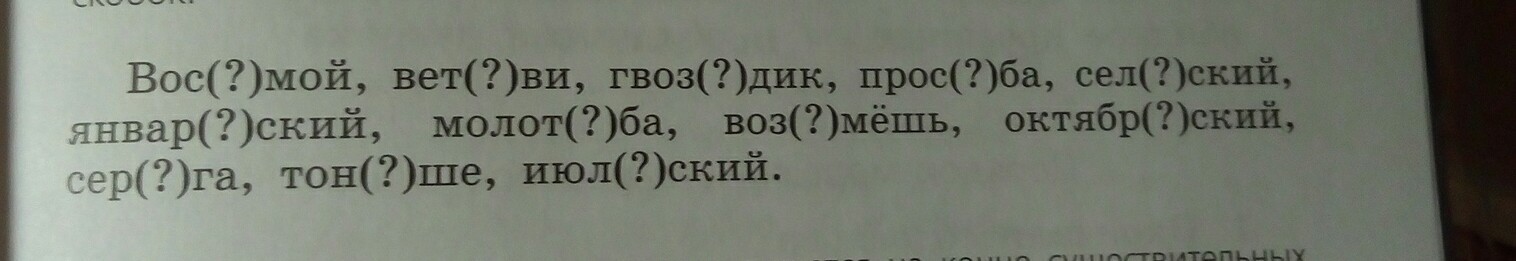 Восьмой, просьба, сельский, январьский, молотьба, возьмёшь, октябрьский, серьга, тоньше, июльский.