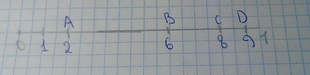 отметьте на координатном луче точки А, B CD, соответсвующие числам 2,6,8,9. Найдите длины отрезков OA OB OC OD