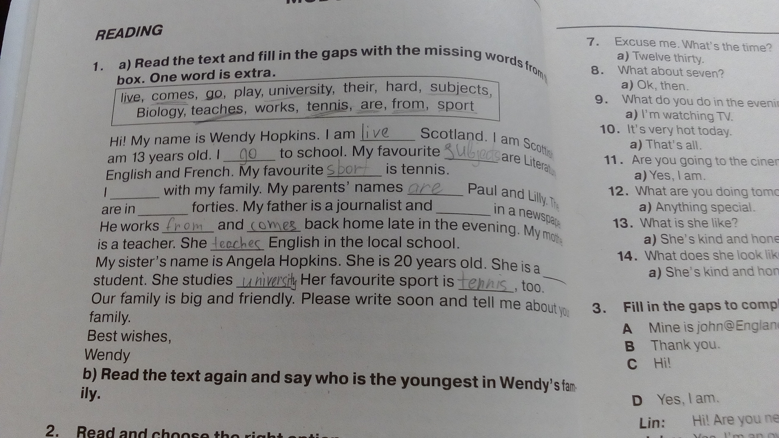 1) from 2) go 3) subjects 4)sport 5) live 6) are 7) their 8) works 9) hard 10) comes 11) teaches 12) university 13) Biology 14) tennis