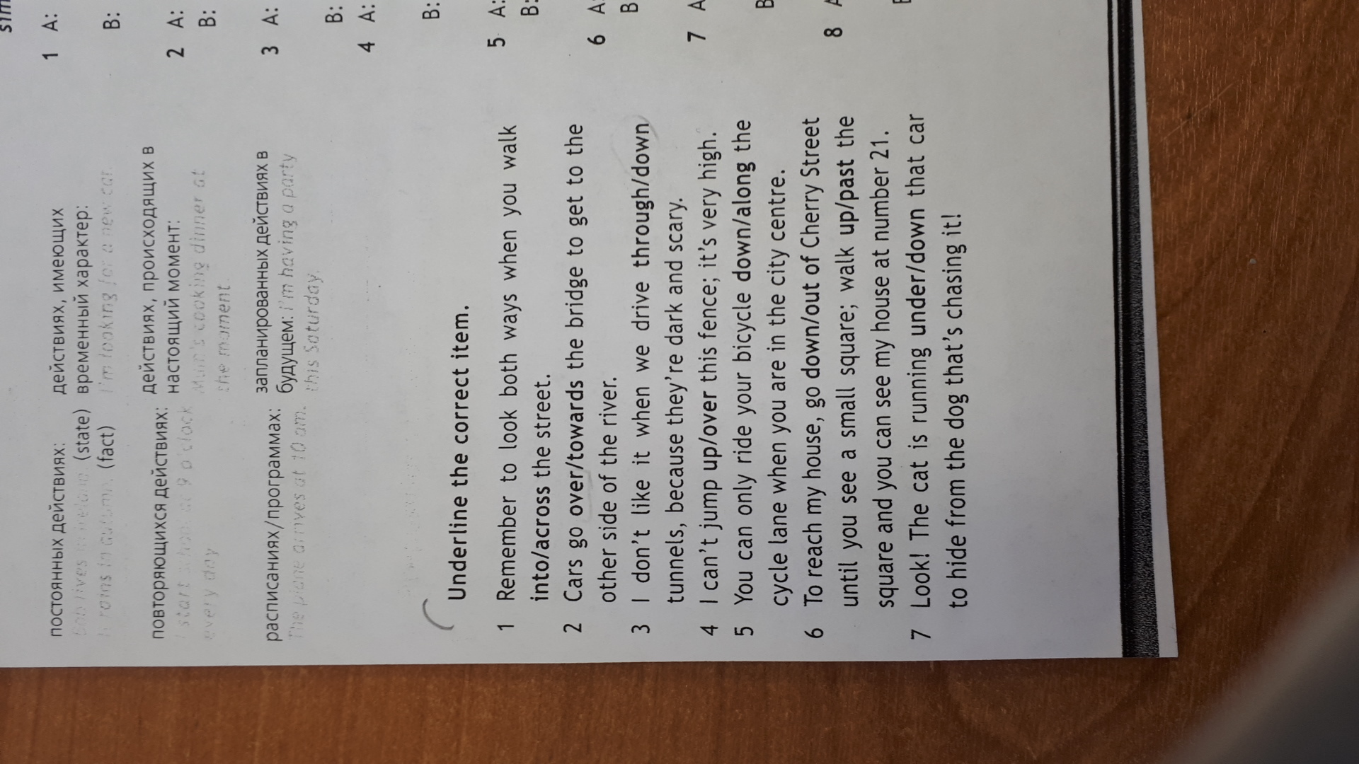 1) across 2) over 3) through 4) over 5) down 6) down, past 7) under