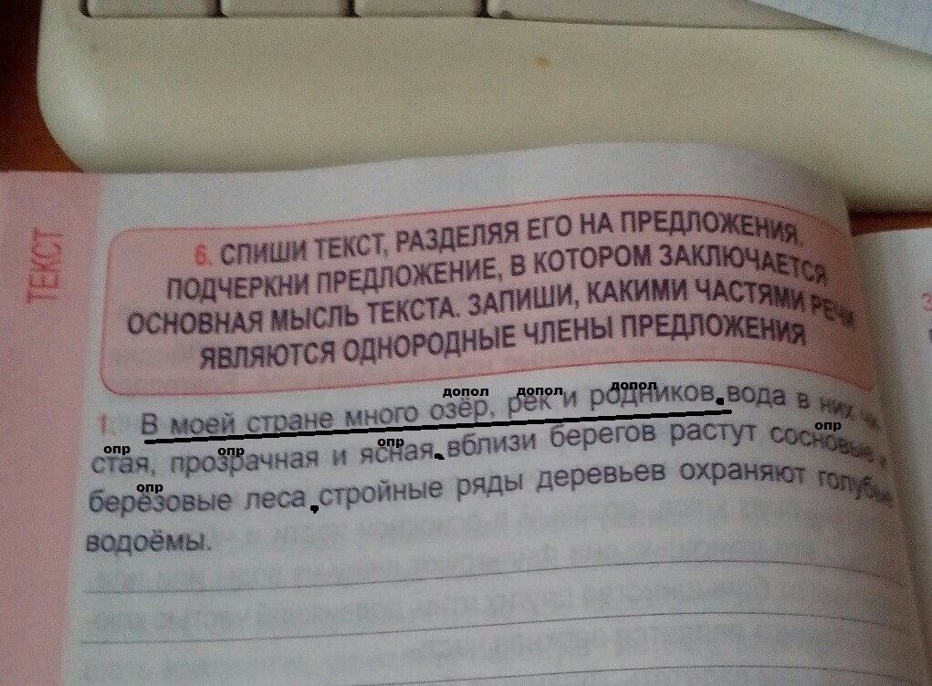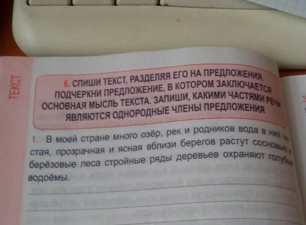 Спишите текст разделяя его на предложения подчеркните предложения в котором заключается основная мысль текста Запиши какие части речи являются однородные члены предложения в моей стране много озер рек родников вода в них чистой прозрачной и ясно вблизи берегов растут сосновые и березовые леса и стройные ряды деревьев охраняет голубые водоема 4 класс русский язык
