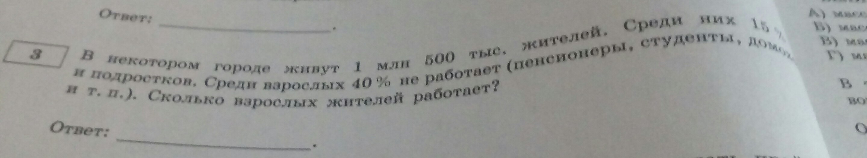 Тогда из 1,5 млн. жителей 85% составляют взрослые (это 1500000*0,85=1275000 чел.), из которых работают (100-40)%=60% (то есть 1275000*0,5=765000 чел).
