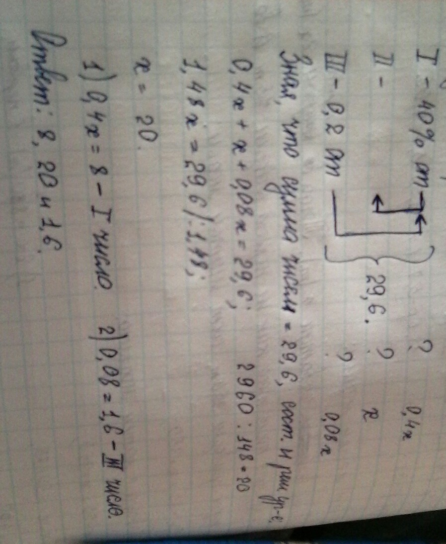 Помогите решить срочно!!! Первое число составляет 40% от второго, а третье число 15 от первого, их сумма равна 29,6. Найдите эти числа.