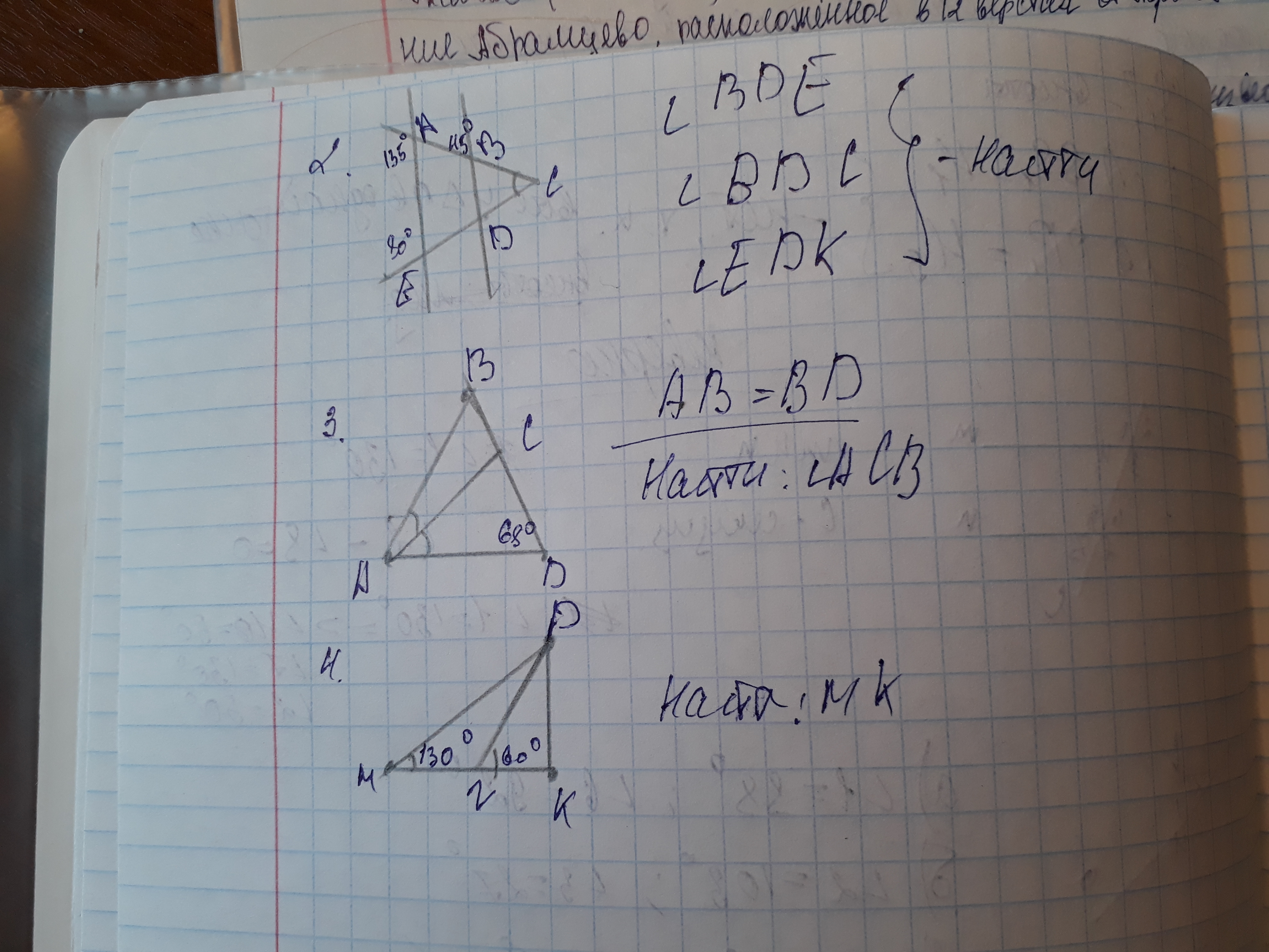 1. Если AB=BD, то треугольник ABD равнобедренный, следовательно угол BAD=углу BDA=68 градусов