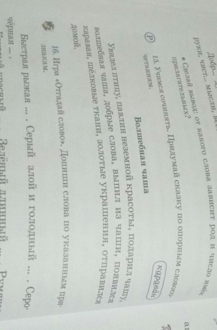 Однажды мальчик гулял по лесу и увидел замечательную птицу. Это был павлин не земной красоты. Мальчик вежлево поздоровался с павлином и спросил что он тут делает. Павлин рассказал мальчику что он маг и может исполнить любое его желание. Мальчик попросил у него то чего нет не у одного ребенка на всей земле. Павлин не долго думая сказал что может дать мальчику волшебную чашу и сказал что ели мальчик выпьет из чаши то случится чудо. Мальчик сделал все ято ему сказали и после того как он выпил из чаши перед ним появился корован с людьми которые предлагали мальчику шелковые ткани и золотые украшения. Мальчик с удовольствием взял все что ему предлога ли и веселой походкой пошел домой.
