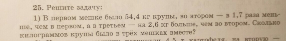 2 мешок - 54.4/1.7 = 32 кг в 1.7 раза меньше чем в первом