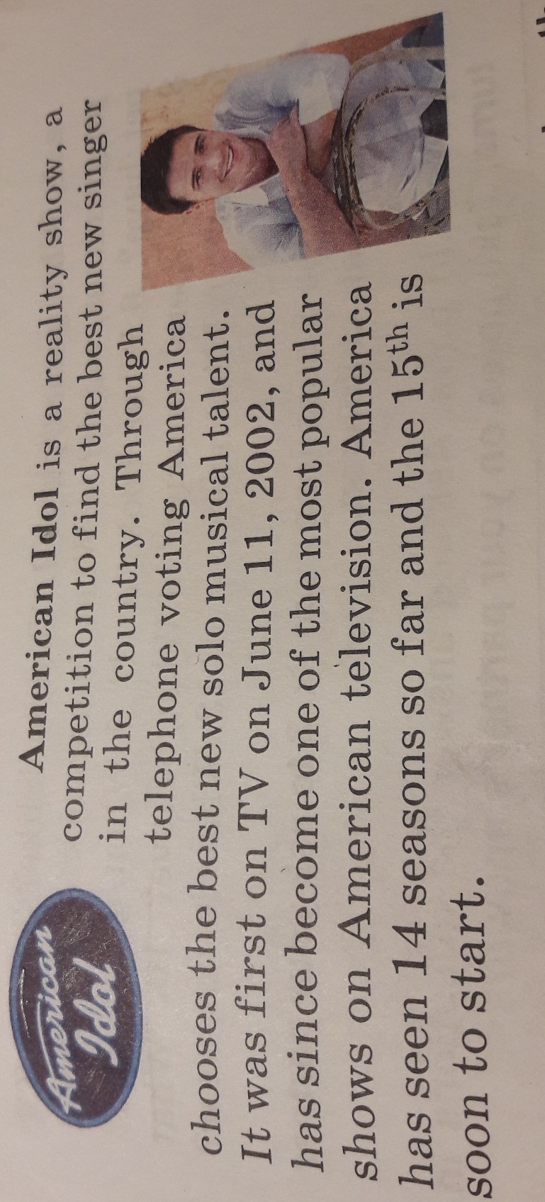 "Американский идол" - это реалити-шоу, состязание, в котором ищут лучшего нового певца в стране. С помощью телефонного голосования Америка выбирает лучший новый музыкальный талант, выступающий в одиночку. Впервые это шоу вышло на экраны 11 июня 2002 года, и с тех пор стало одним из самых популярных шоу на американском телевидении. На данный момент Америка посмотрела 14 сезонов и 15 выходит скоро.