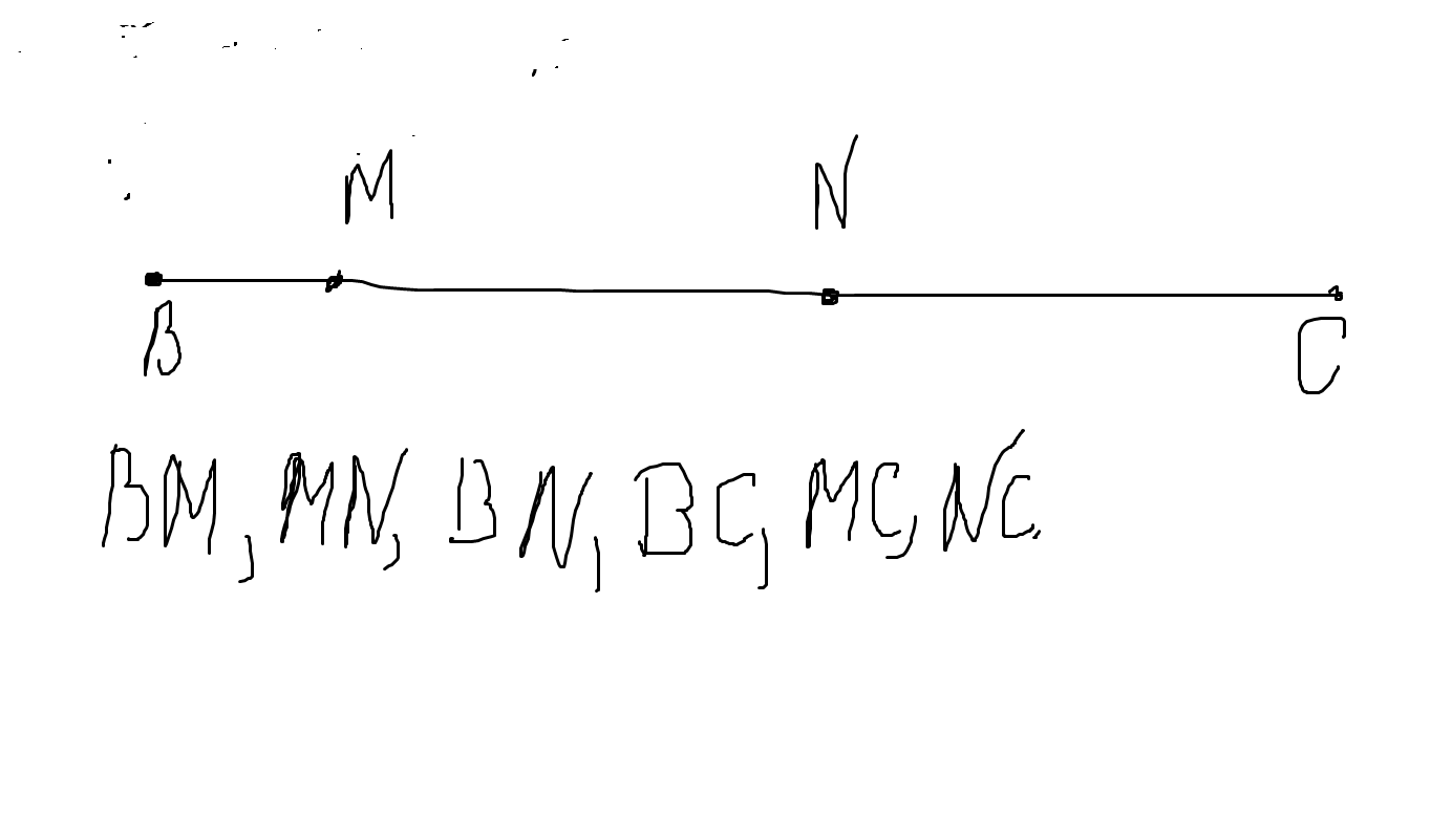 начерти отрезок BC и отмети на нём точками M и N так , чтобы точка M лежала между точками B и N. Запишити все получившияся отрезки с конацами B , M , N ,и C Сравните отрезки