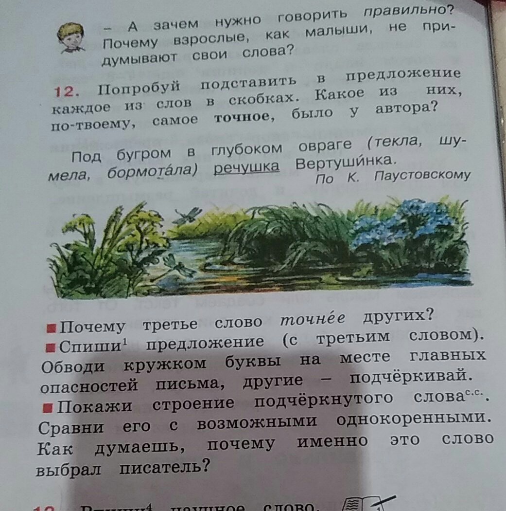 Под бугром в глубоком овраге бормотала речушка Вертушинка. Слово "течет" употребляют, когда говорят о большой, широкой, полноводной реке, у которой почти не заметно течения воды. Слово "шумела" связано с громким звуком, шумом. Но в нашем случае речка небольшая — речушка. Она находится на дне глубокого оврага. Ее шум наверху почти не слышен. И его можно сравнить с невнятным бормотанием.