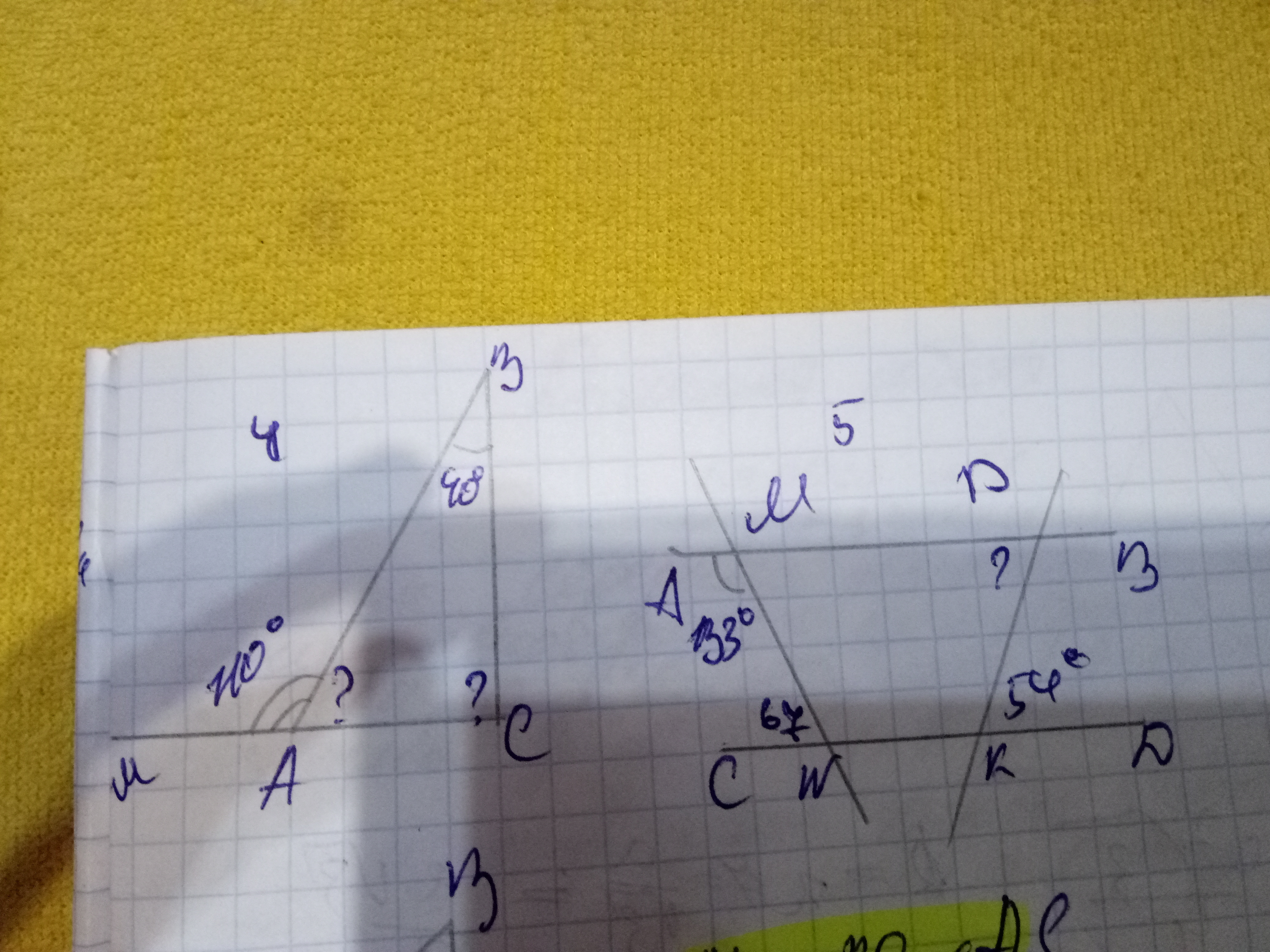 я только с первым могу помочь, во втором там по идее две параллельные и из свойств находишь угол, но у тебя в задаче они не параллельные по данным. а вот первая