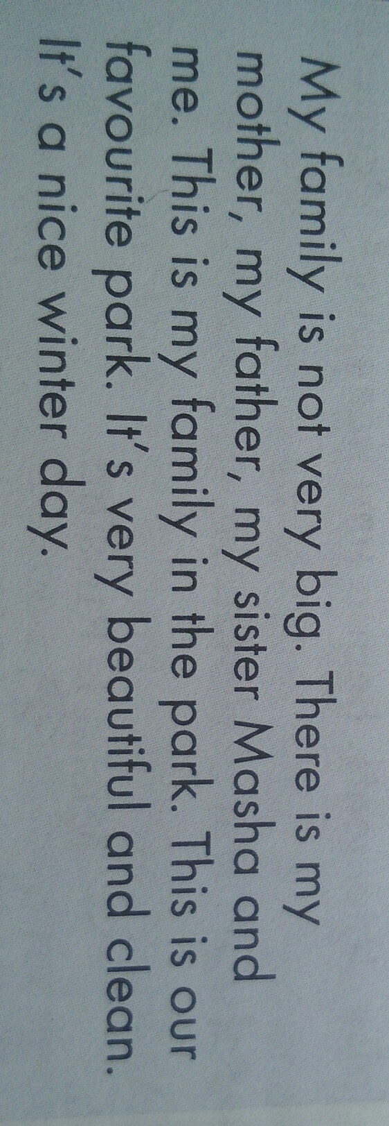 У меня не очень большая семья. В ней есть моя мама,мой папа ,моя сестра Маша и я. Это моя семья в парке.это наш любимый парк. Он очень красивый и чистый . Это хороший зимний день.