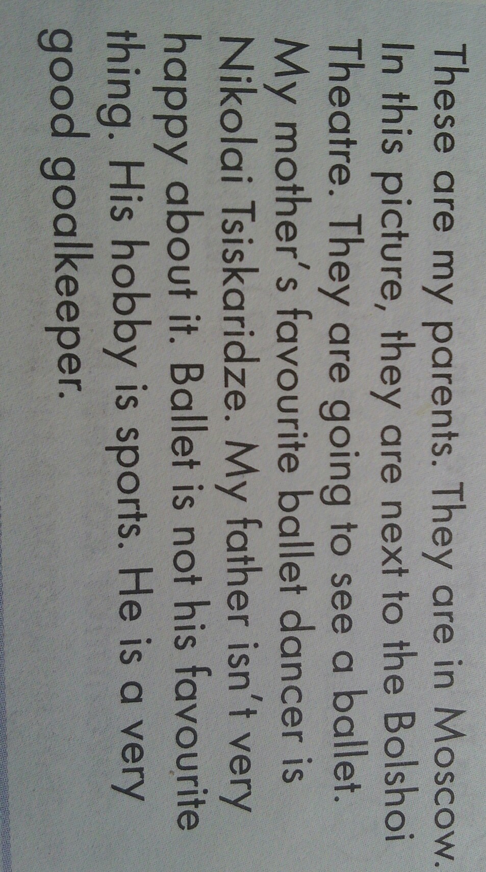 Это мои ррдители.Они в Москве.На этой картине они направляются на Большой Театр.Они идут туда смотреть балет.Мамин любимый танцор балета это Николай Тсикаридзе(както так).Млй папа не очень счастлив.Балет его не любимая вещь.Его хоби спорт.Он очень хороший вратарь.