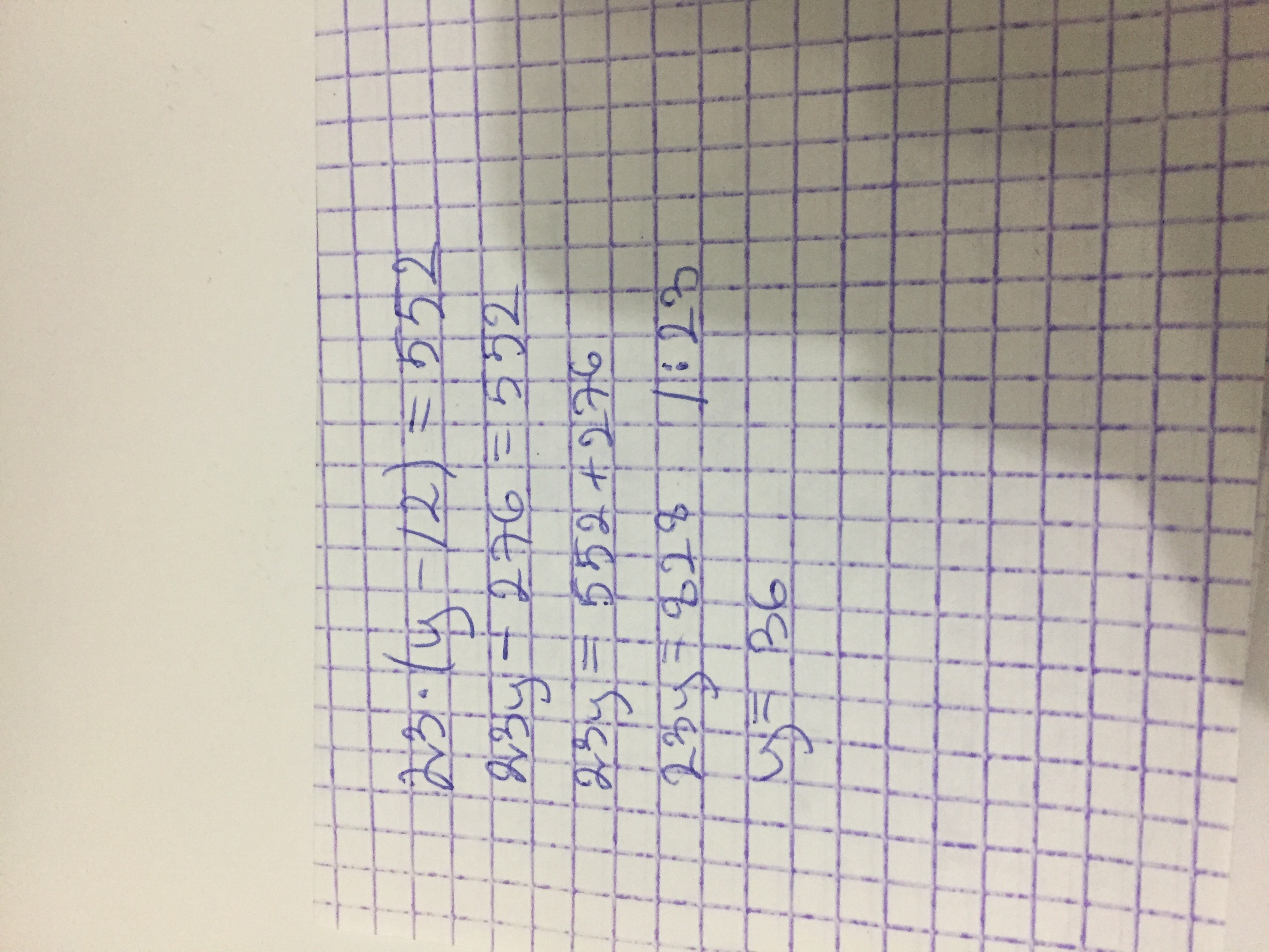 Лучше скобки не раскрывать: у-12=552:23; у-12=24; у=24+12; у=36. Устно)))