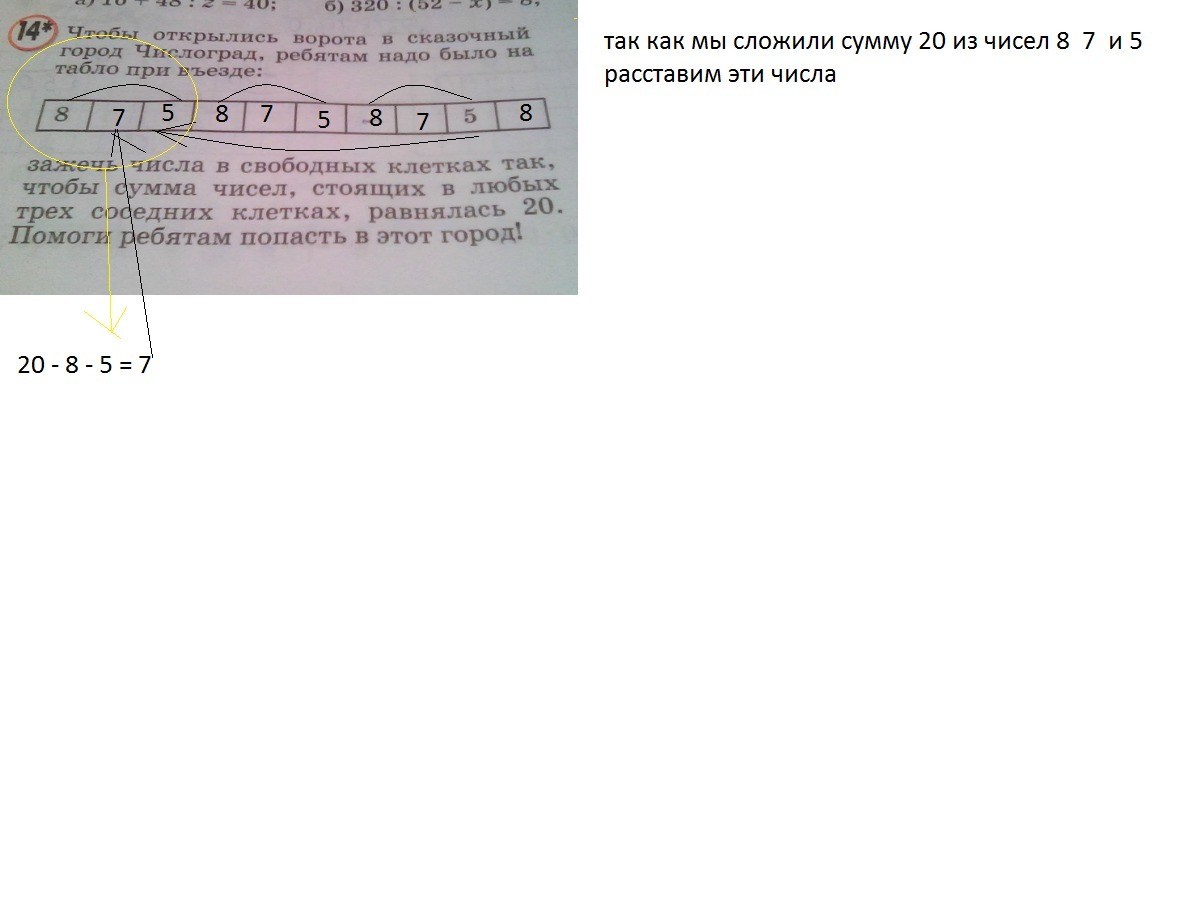 Чтобы открылись ворота в сказочный город Числоград, ребятам надо на табло при въезде зажечь числа в свободных клетках так чтобы сумма чисел стоящих в трех соседних клетках, равнялась 20. Всего 10 клеток в первой 8 в предпоследней 5