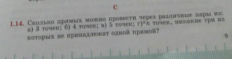 Сколько прямых можно провести через различные пары из: а) 3 точек; б) 4 точек; в) 5 точек; г) *n точек, никакие из которых не принадлежат одной прямой?