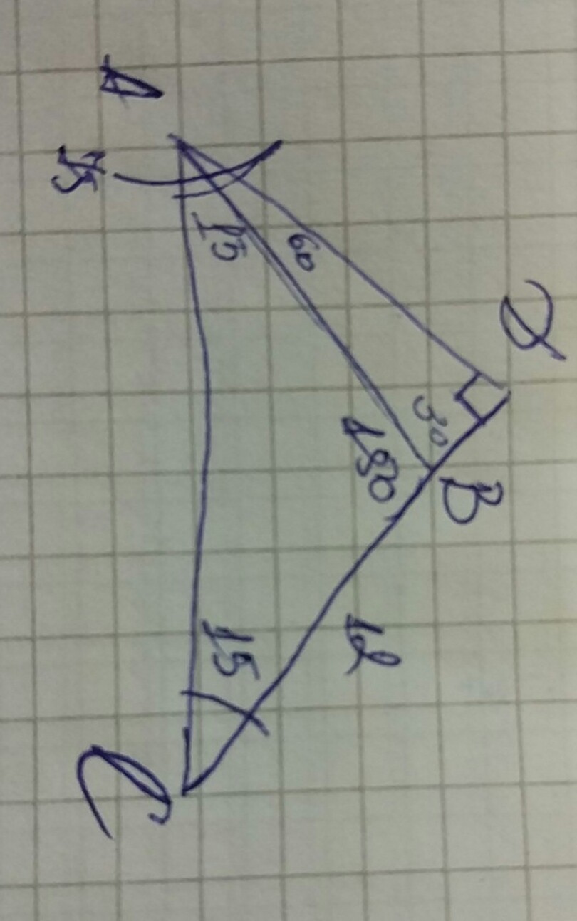 2. В тупоугольном треугольнике высота к боковой стороне лежит за пределами треугольника. Имеем прямоугольный треугольник ADC с прямым углом D. Если угол DCA=15 градусов, то угол DAC равен 90-15=75 градусов, тогда угол DAB=75-15=60 градусов. Тогда DBA =30 градусов.