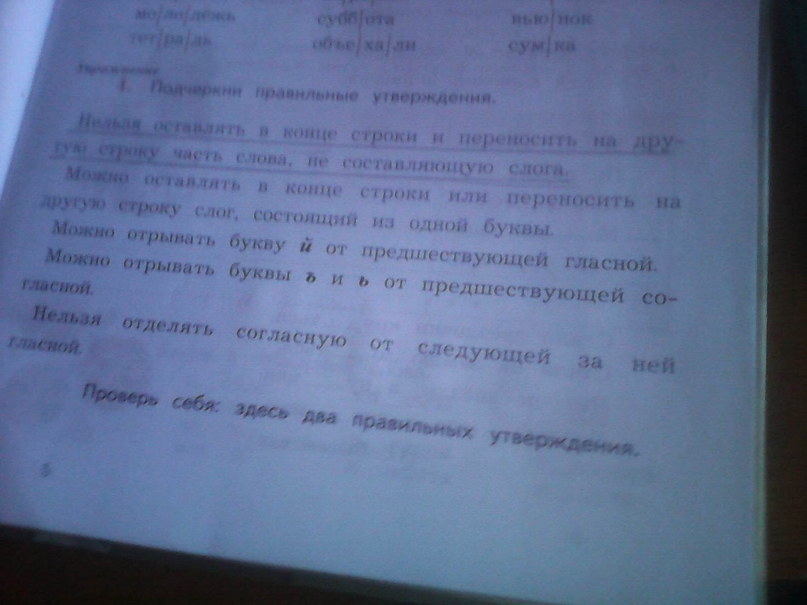Подчеркни правильные утверждения. Проверь себя:здесь два правильных утверждений. Можно отрывать й от предшествующей гласной, можно отрывать ь и ъ прешедствующей согласной, нельзя отделять согласную от следующей за ней гласной.