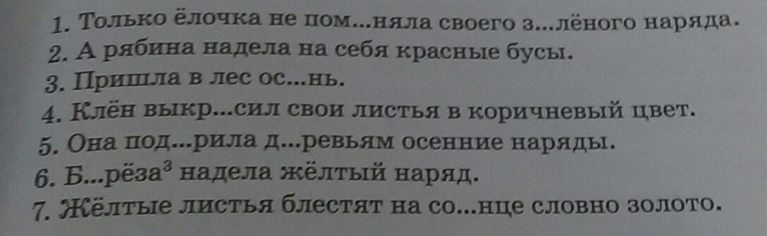 Пришла в лес осень. Она подарила деревьям осенние наряды. Берёза надела желтый наряд, желтые листья блестят на солнце словно золото. Клен выкрасил свои листья в коричневый цвет, а рябина надела на себя красные бусы.Только ёлочка не поменяла своего зелёного наряда.