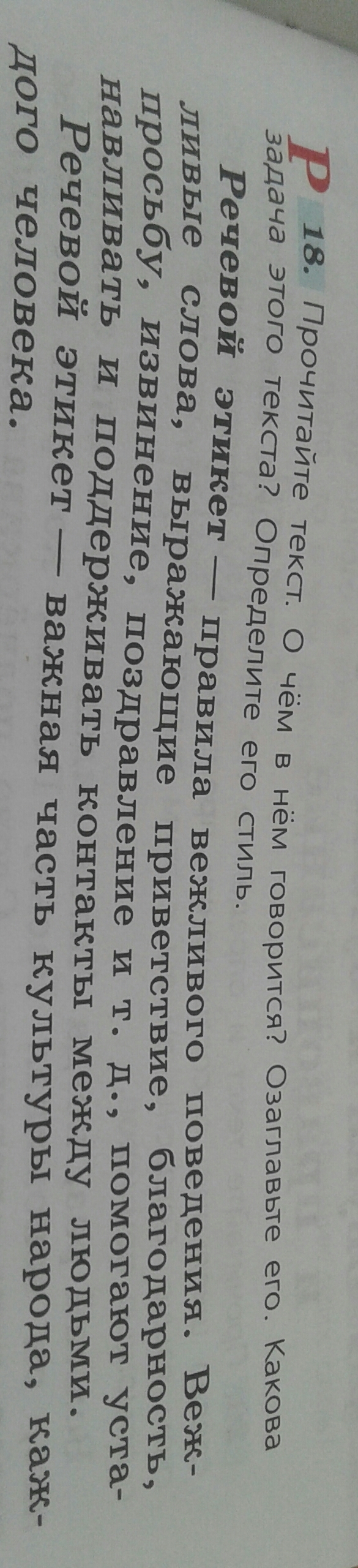 В тексте говорится о том, что такое правила вежливого поведения, или, другими словами, речевой этикет. Задача текста - донести информацию о важности и необходимости соблюдения правил вежливого поведения. Стиль текста - научный.