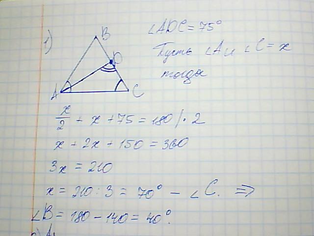 1.В равнобедренном треугольнике ABC с основанием AC проведена биссектриса AD, так что угол ADC=75 градусов. найдите угол B. Помогите пожалуйста.
