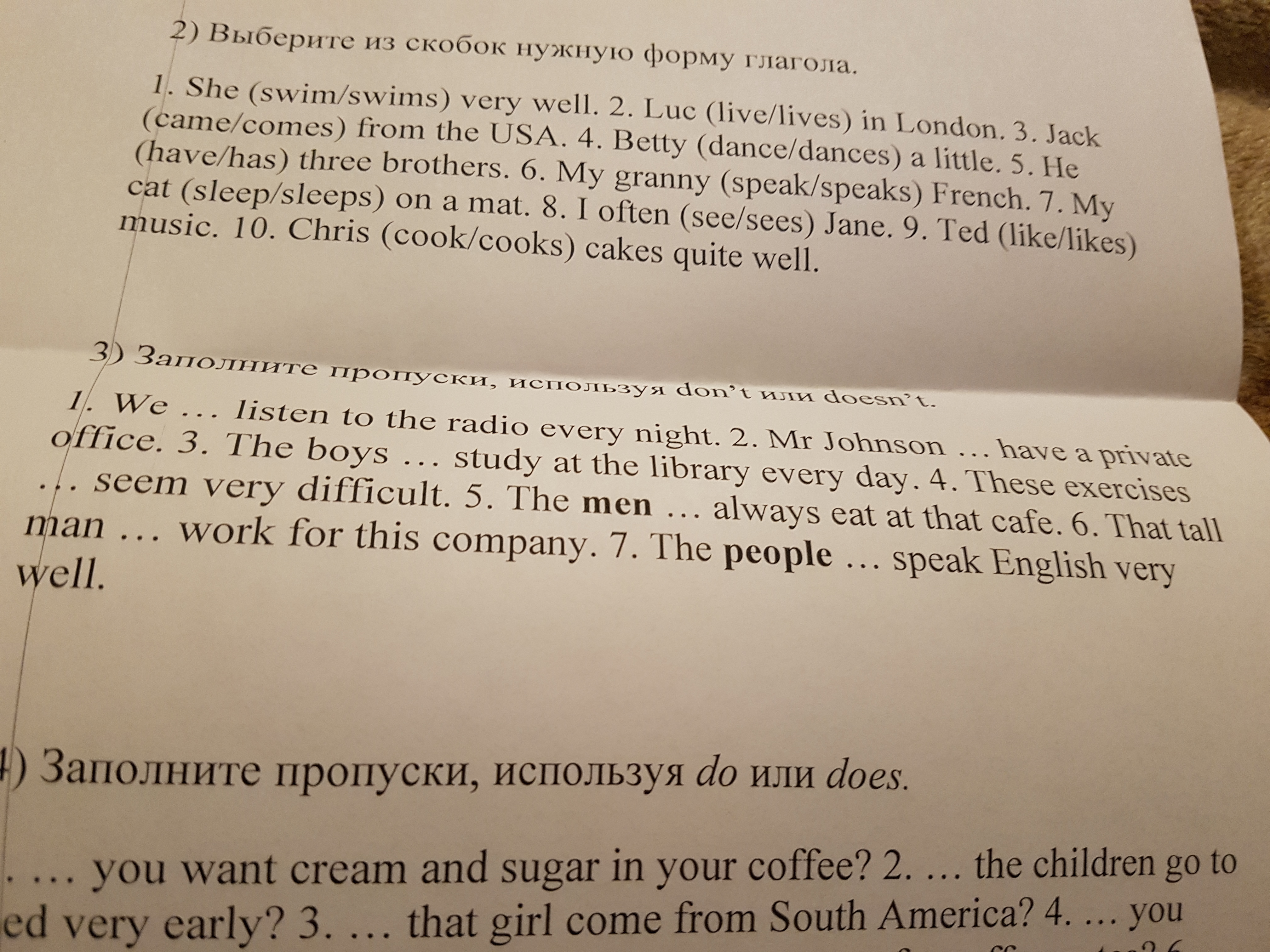 3 задание : 1 don't 2 doesn't 3. Don't 4 don't 5. Doesn't 6 doesn't. 7 don't.