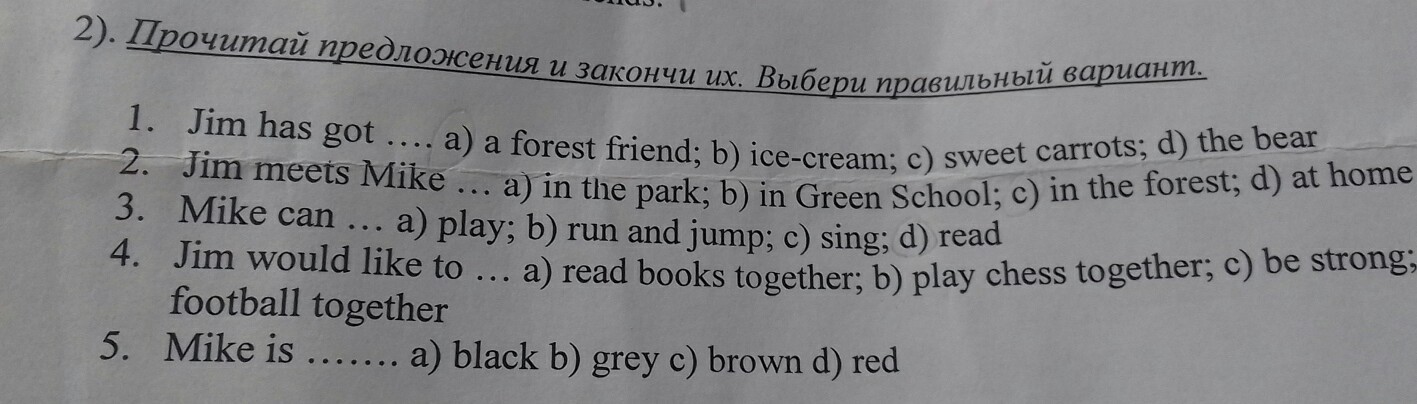 Джим получил a) друг, медведь 2. Джим встречает ледяное мороженое, c) сладкую морковь; г) д) дома Майка в парке, бо, в зеленой школе. в лесу: c) 3. Майк может: а) играть; б) бегите и петь: d) читайте скачок, 4. Джим хотел бы: а) читать книги вместе: б) играть в шахматы вместе c быть сильным футболом вместе 5. Майк черный b) серый c) коричневый d) красный