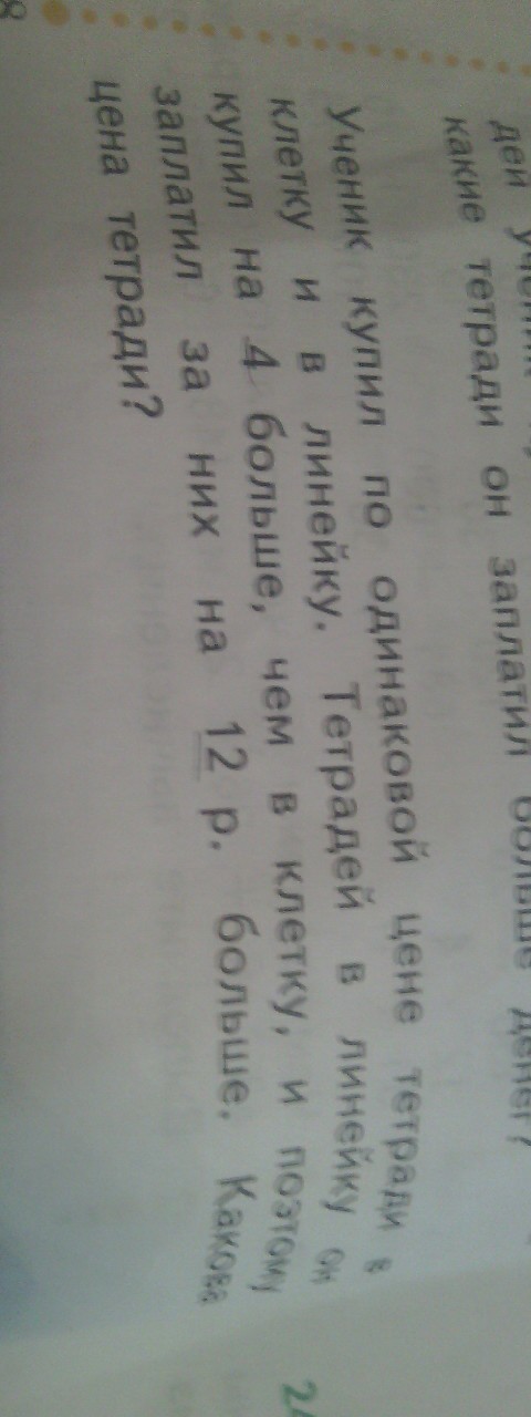 Ученик купил по одной цене тетради в клеточку и в линейку тетради в линейку он купил на 4 больше чем в клеточку и поэтому заплатил за них на 12 руб больше Какова цена тетради