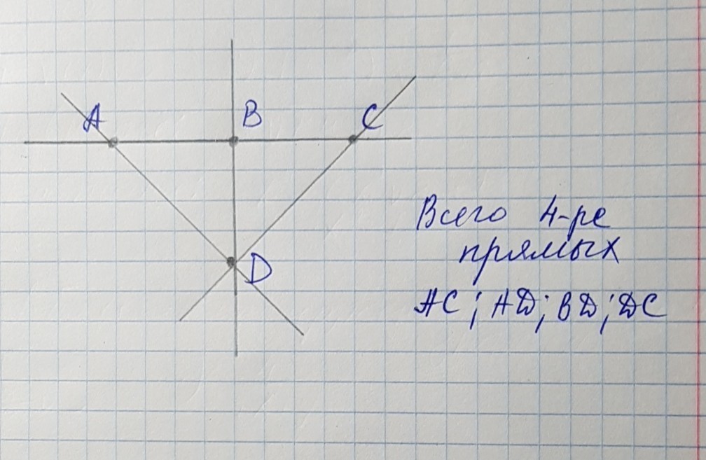 Отметьте точки A, B, C, D так, чтобы точки A, B, C лежали на одной прямой, а точка D не лежала на ней. Сколько получиться прямых?