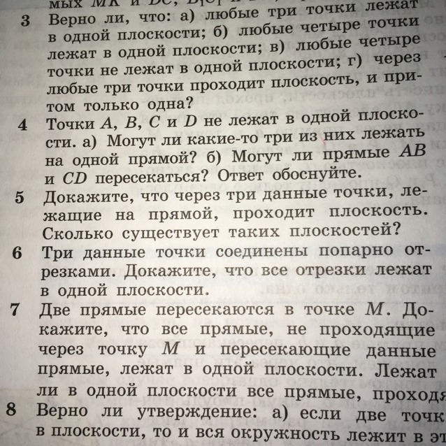 6)Через три точки можно провести единственную плоскость. В силу того, что две точки каждого отрезка принадлежат этой плоскости (концы отрезков), то и все отрезки лежат в этой плоскости (аксиома А2).