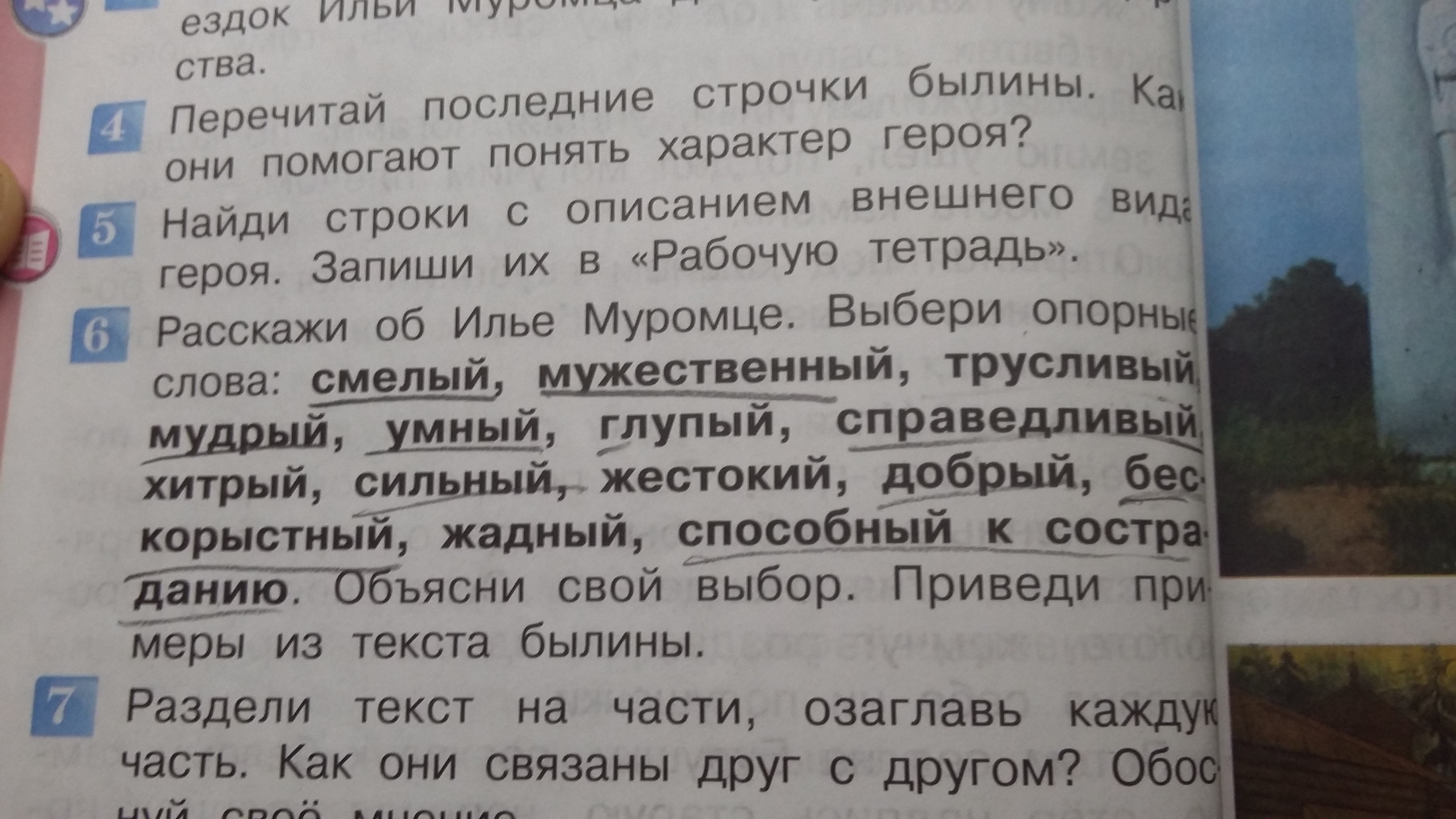 Илья оказывается любящим и почтительным сыном — одна из основных черт в его характере, эта черта присуща и другим нашим богатырям. Она свидетельствует о крепости семейного начала в древней русской жизни. Отец Ильи, крестьянин Иван Тимофеевич, благословляет сына. Доброта, восходящая до великодушия, — основная черта его нравственного образа, где можно, там он щадит и врага. С этим тесно связаны самообладание и спокойствие, тоже характерные его признаки.