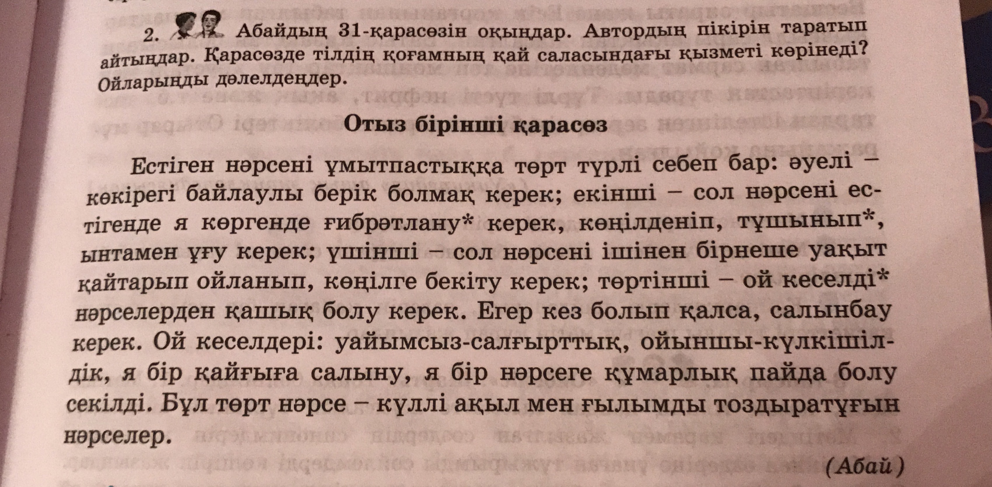 Абайдын 31-ши карасоз деген ангимесинде адам бирнерсени естигиен кезде угып тусину керек дейди. Бирдене ести