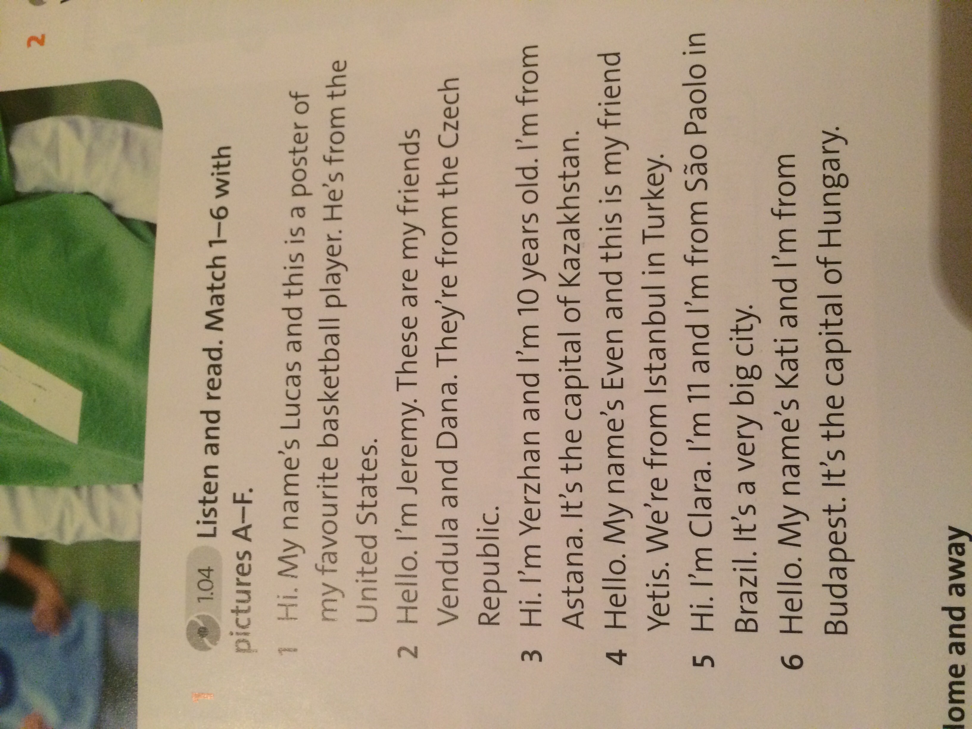 Здравствуй. Меня зовут Лукас, и это плакат моего любимого баскетболиста. Он из Соединенных Штатов.Здравствуйте. Я Джереми. Это мои друзья Вандула и Дана. Они из ЧехииЗдравствуй. Я Ержан и мне 10 лет. Я из Астаны. Это столица КазахстанаЗдравствуйте. мое имя Even, и это мой друг Йетис. Мы из Стамбула в Турции.Привет, я Клара. Мне 11 лет, и я из Сан-Падло в Бразилии. Это очень большой городЗдравствуйте. Меня зовут Кати, а я из Будапешта. Это столица Венгрии