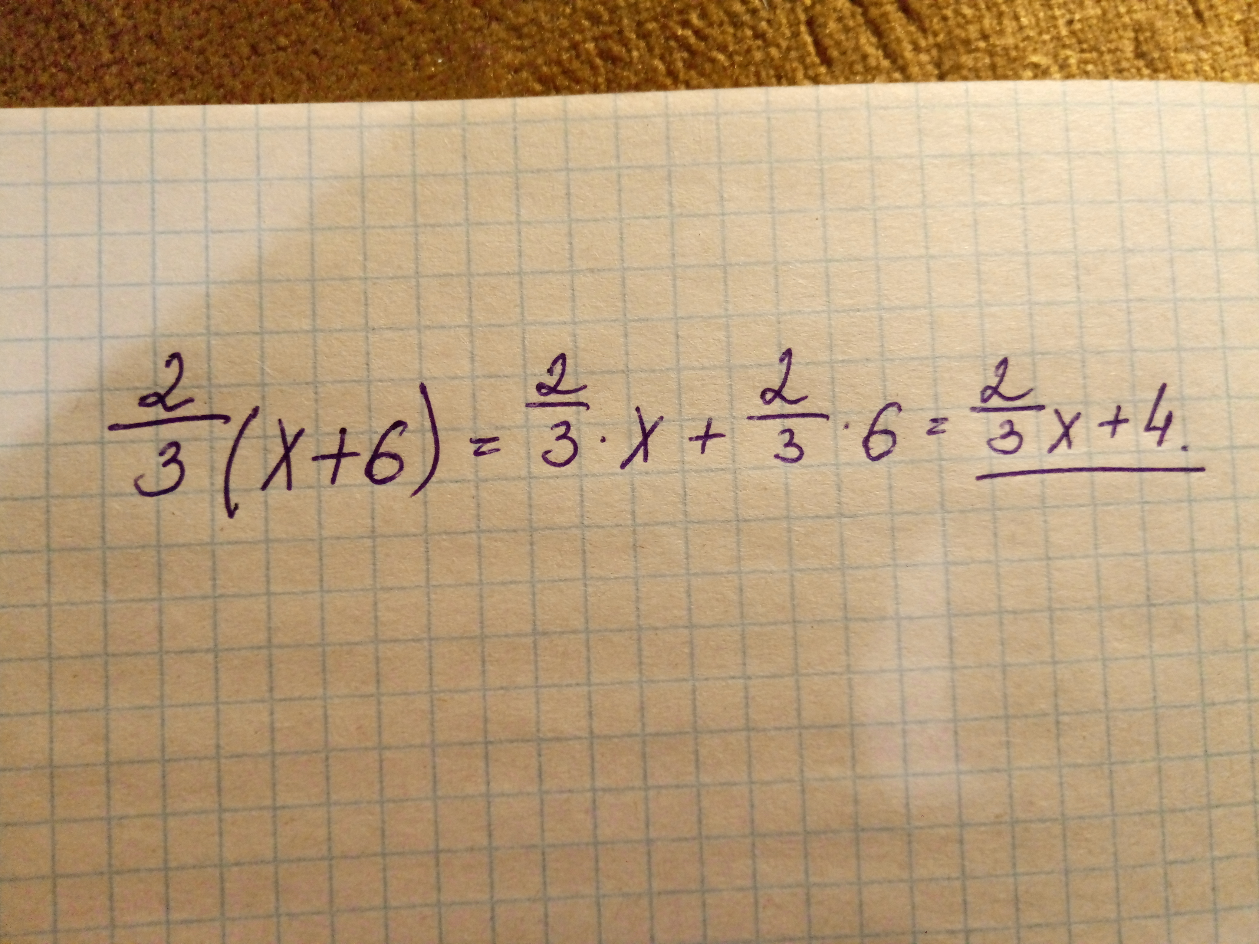 должно быть так:мы должны умнодить дробь две третьих на каждое из слогаемых в скобках,а затем получившиеся значения записать в виде суммы