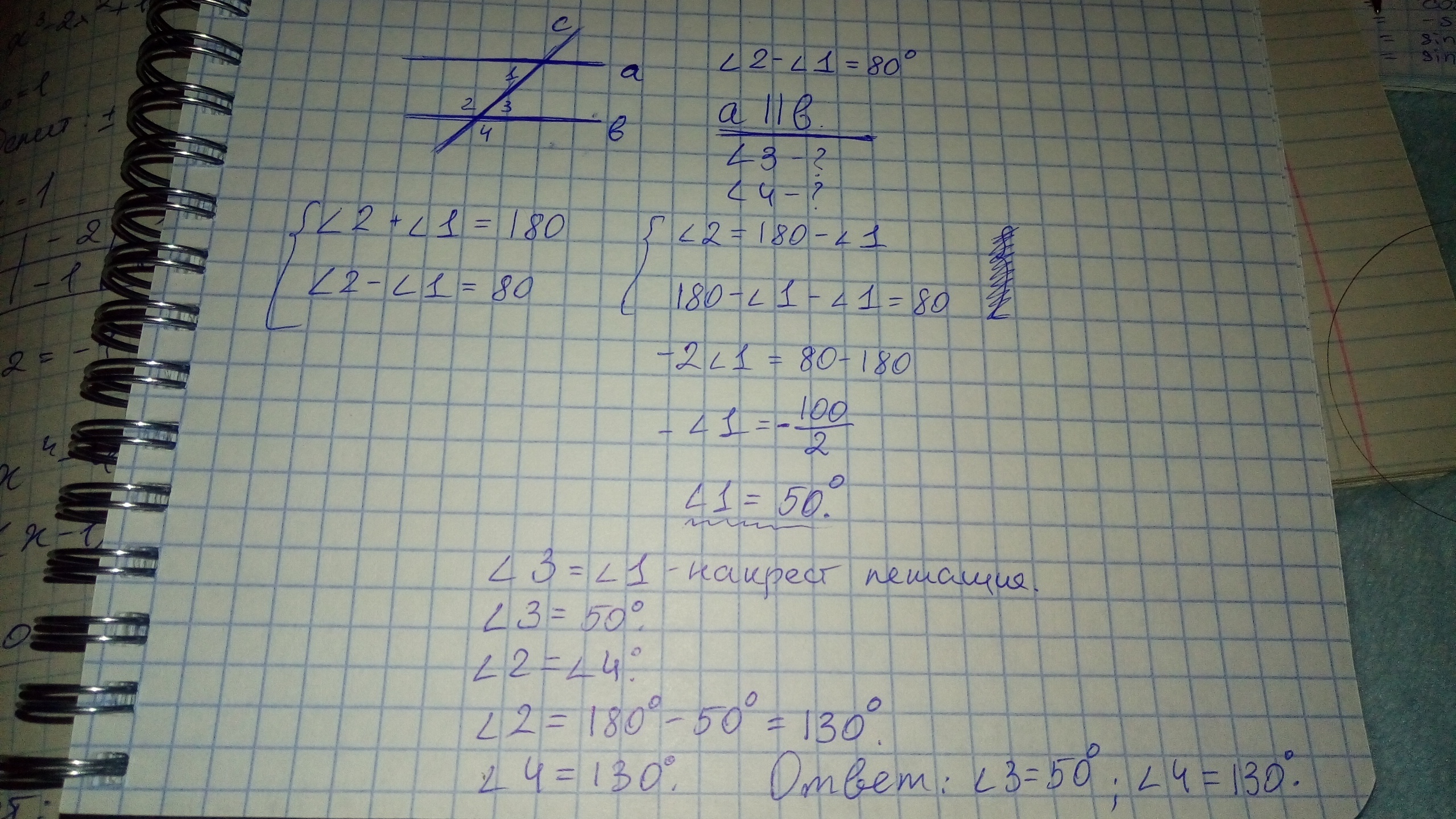 угол 3 также равен 80, а 4(180-80) равен 100