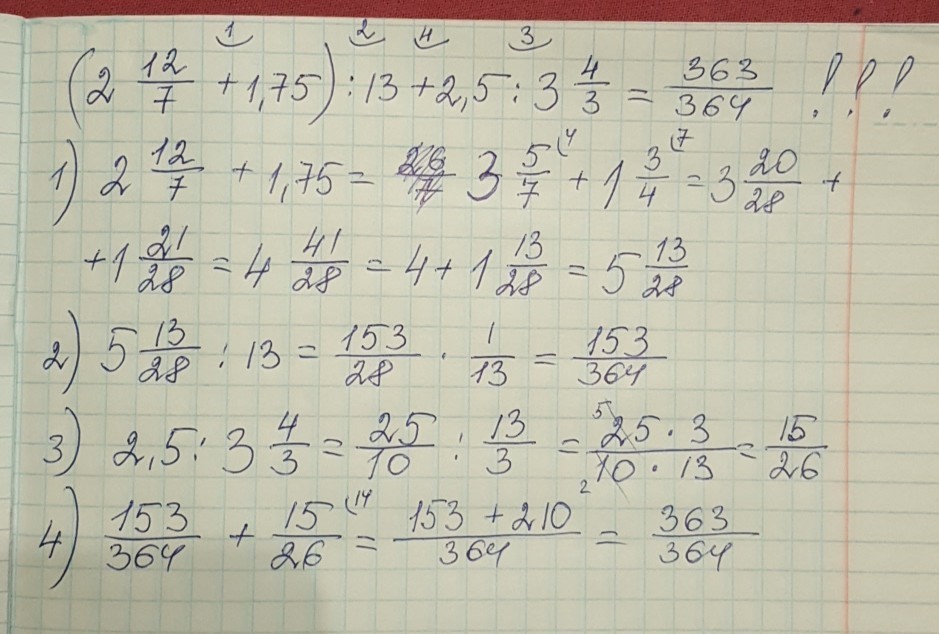 (2 12/7+1,75):13+2,5:3 4/3 = 363/364