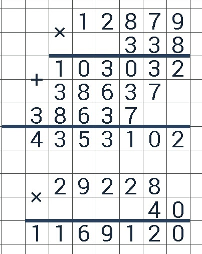 338 умножить 12 879* 29 228 х 40 можете еще какие нибудь примеры написать в столбик с решением помагите пожалуйста не успеваю надо до завтра все успеть