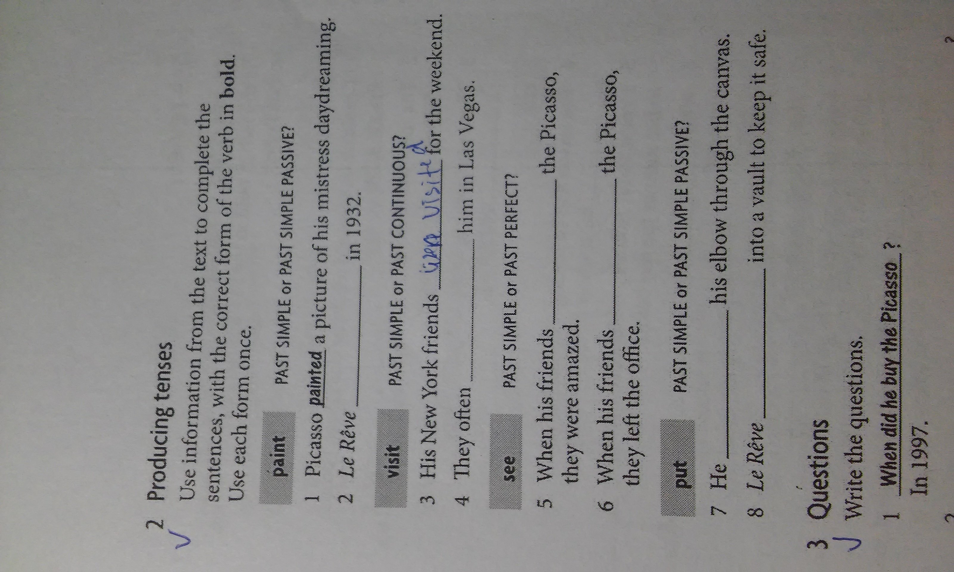2 Время изготовления v Используйте информацию из текста, чтобы выполнить предложения, с правильной формой глагола, выделенного полужирным шрифтом. Используйте каждую форму один раз. краска ПРОШЛОЕ ПРОСТОЕ ИЛИ ПРОШЛОЕ ПРОСТОЕ ПАССИВНОЕ? 1 Пикассо нарисовал картину своей любовницы, мечтая 2 Ле Реве в 1932 году. ПРОСТО ПРОСТО или ПРОШЛОЕ CONTINUO 3 Его друзья в Нью-Йорке в Митте на выходные. 4 Они часто его в Лас-Вегасе. Я ПРОСТО ПРОСТО или ПРОШЛЫЙ СОВЕРШЕННО? 5 Когда его друзья Пикассо, они были поражены. 6 Когда его друзья Пикассо покинули офис. ставить ПРОШЛОЕ ПРОСТОЕ ИЛИ ПРОШЛОЕ ПРОСТОЕ ПАССИВНОЕ? 7 Он, локоть его через холст. 8 Le Reve, в хранилище, чтобы держать его в безопасности, 3 Вопросы J Напишите вопросы. 1 Когда он купил Пикассо В 1997 году.
