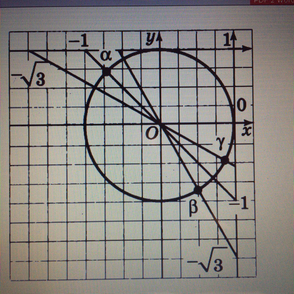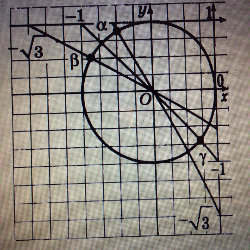 На единичной окружности отмечены точки, соответствующие углам α, β, γ. Определите значение тангенса и котангенса этих углов (рис.1,2,)