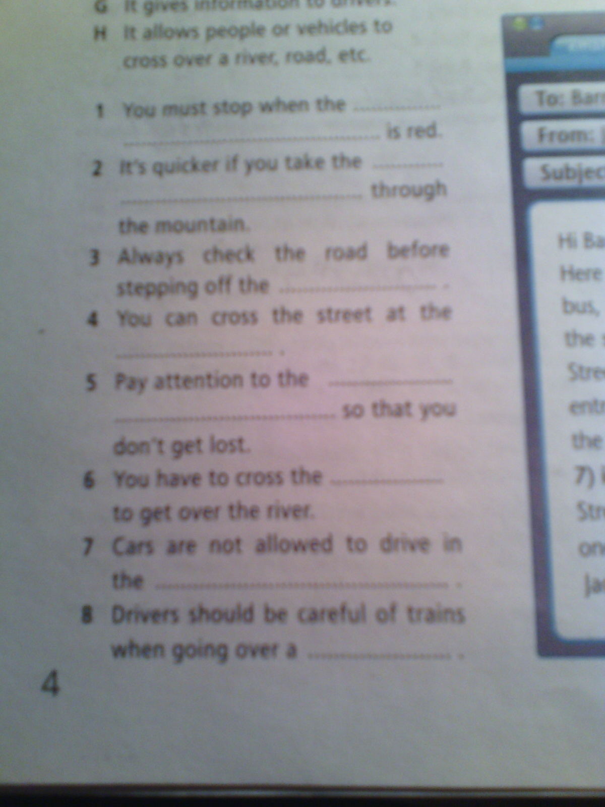 помогите , пожалуйста. СРОЧНО. В проблески надо вставить слова pavement,level crossing,tunnel,bridge,zebra crossing,bus lane,road sign,traffic light.С 1предложения по 8-е.