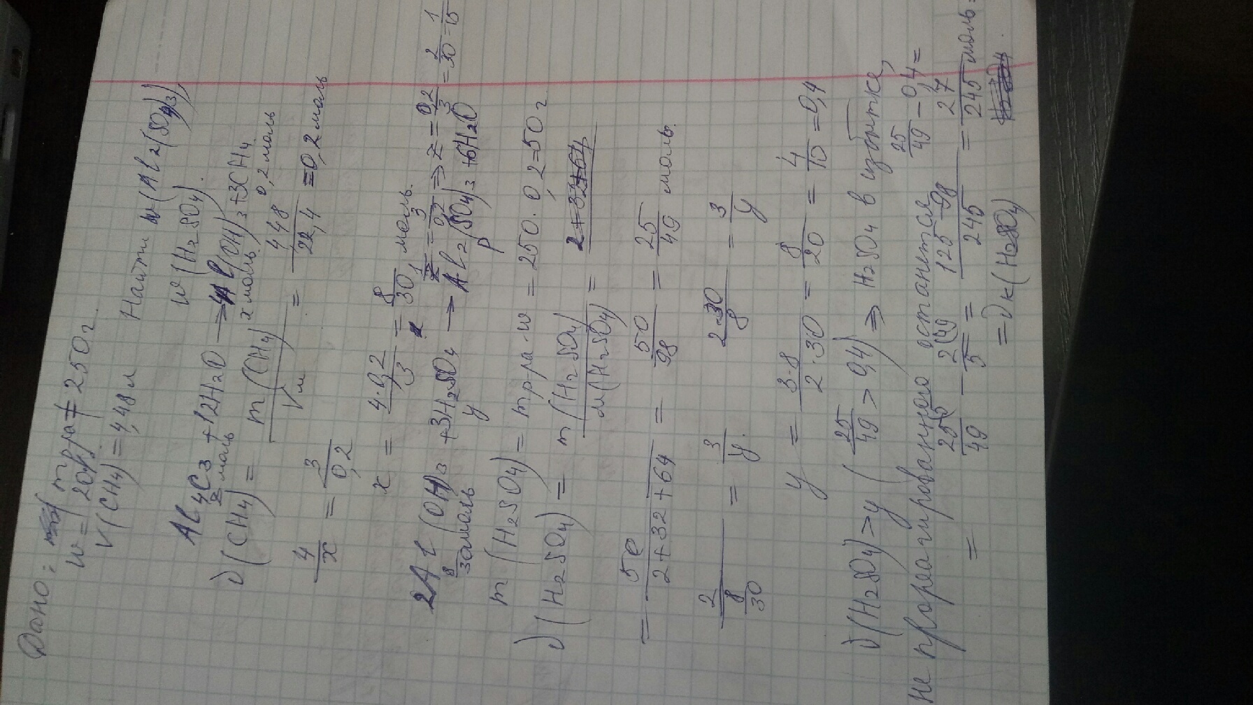 Карбид алюминия растворили в 250 г. 20 % - го раствора серной кислоты.Выделившийся при этом метан занял объем 4,48л (н.у) Рассчитайте массовую долю получившейся соли и серной кислоты в полученном растворе.
