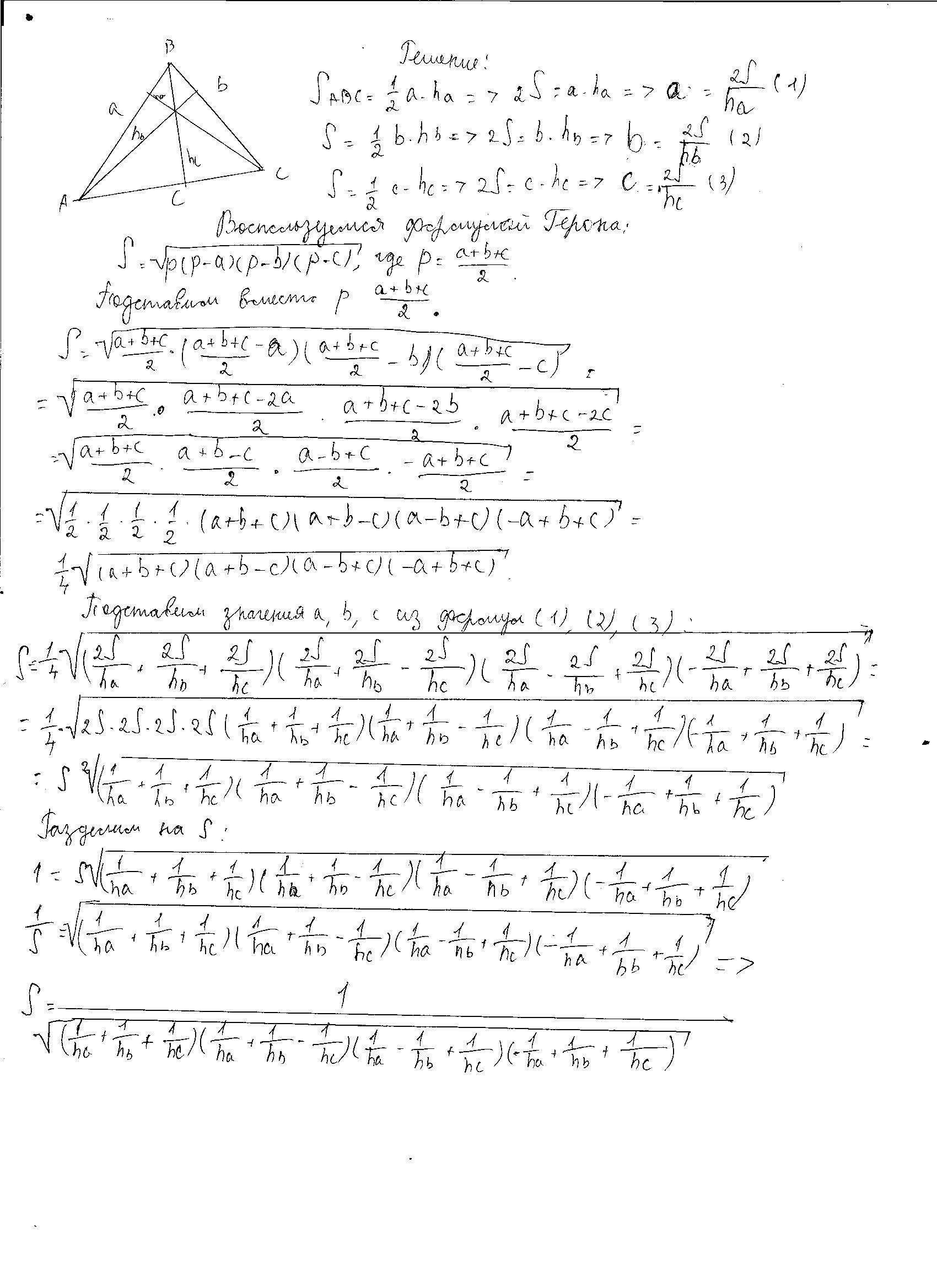 найдите площадь треугольника по трем его высотам ha, hb и hc.