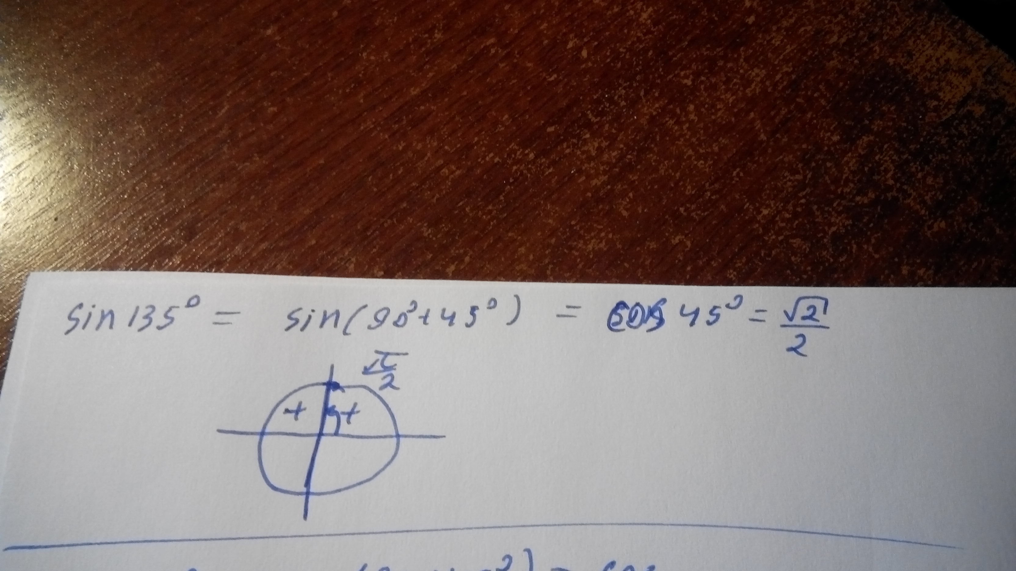 Почему так? Потому что синус в 1 и 2 четверти положителен, а мы как раз и попадаем во вторую четверть тригонометрического круга. Далее точка вертикальная, следовательно функция меняется на кофункцию. cos45=sin45 Для наглядности рисунок в приложении.