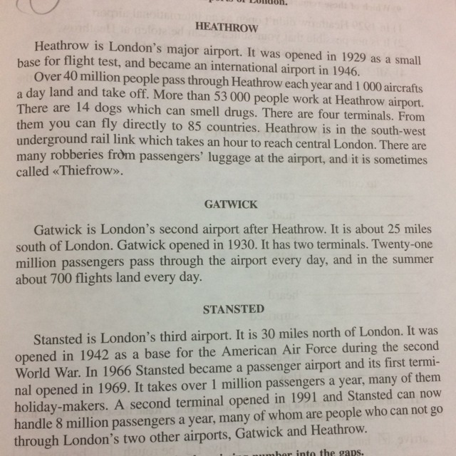 Хитроу является главным айэропортом Лондона. Он был открыт в 1929 году, как маленькая база для летный тестирований, а потом стал интернациональным айэропортом в 1946 году. Более 40 миллионов людей проходят через Хитроу каждый год и 1000 летательный приборов в день приземляются и взлетают. Есть 14 собак, которые могут учуять наркотики. Есть 4 терминала. Через них ты можешь летать в направлении 85 стран.