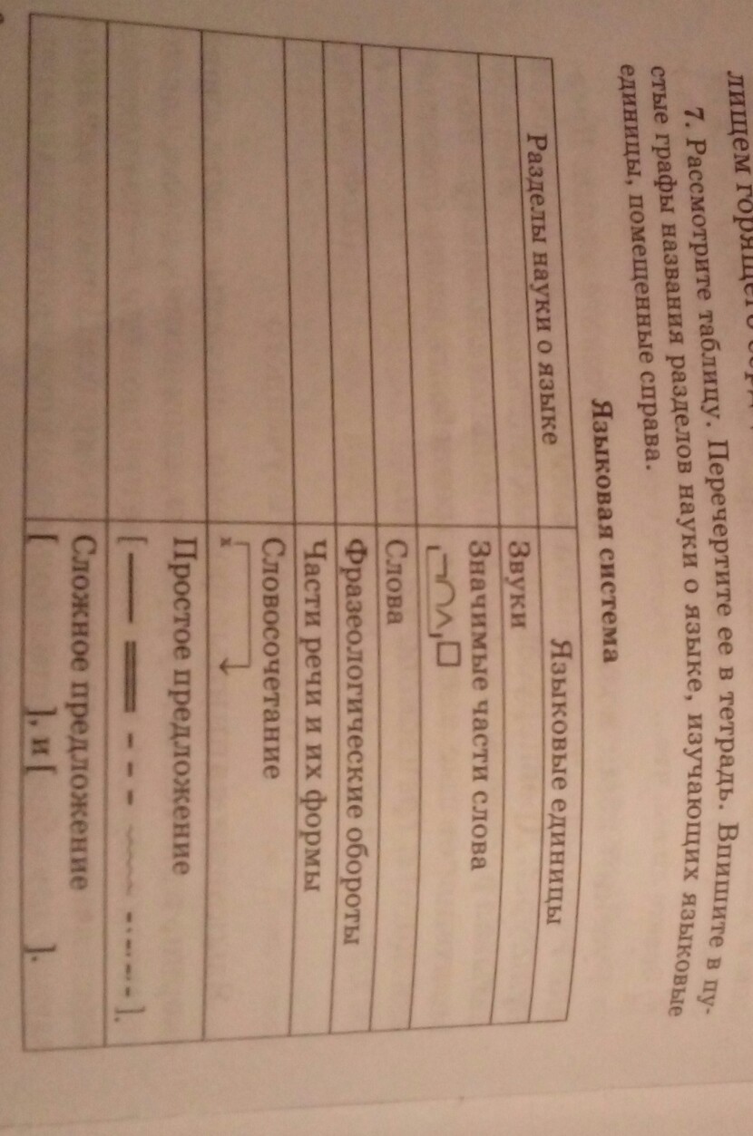 звуки-фонетика, значимая часть слова -морфемика, слова-лексика, археологические обороты-фразеология, части речи и их формы-морфология, словосочитание-синтаксис